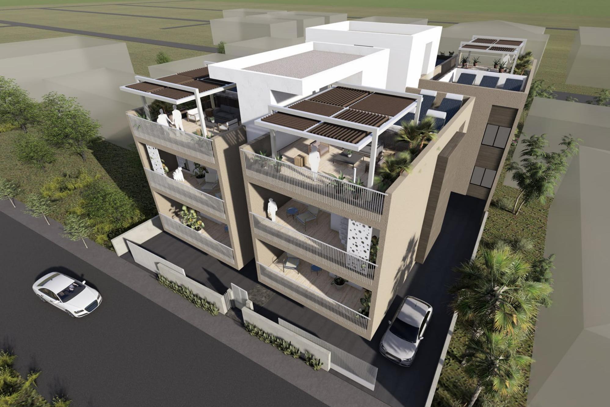 Penthouse for sale in Livadia, Larnaca. The project was designed in such a way as to combine comfort and convenience in all aspects. There are 11 apartments in the building. Ground floor: 1 apartment with garden. Ground floor: 4 2-bedroom apartments and 1 1-bedroom apartment. Second floor: 4 2-bedroom apartments, each with a roof garden and pergola, and 1 1-bedroom apartment. The project provides for the installation of solar panels on the roof, which will save electricity. The apartment combines high-end design, finishes and the latest trends using high-quality thermal insulation materials, finishes and plumbing. The apartments have functional layouts and spacious verandas. The complex has a good location: close to all amenities, right behind the building, there is a Main street and a public garden, as well as another large public garden behind the building, so all apartments have a beautiful view. Livadia is a modern city 15 minutes from Larnaca International Airport.